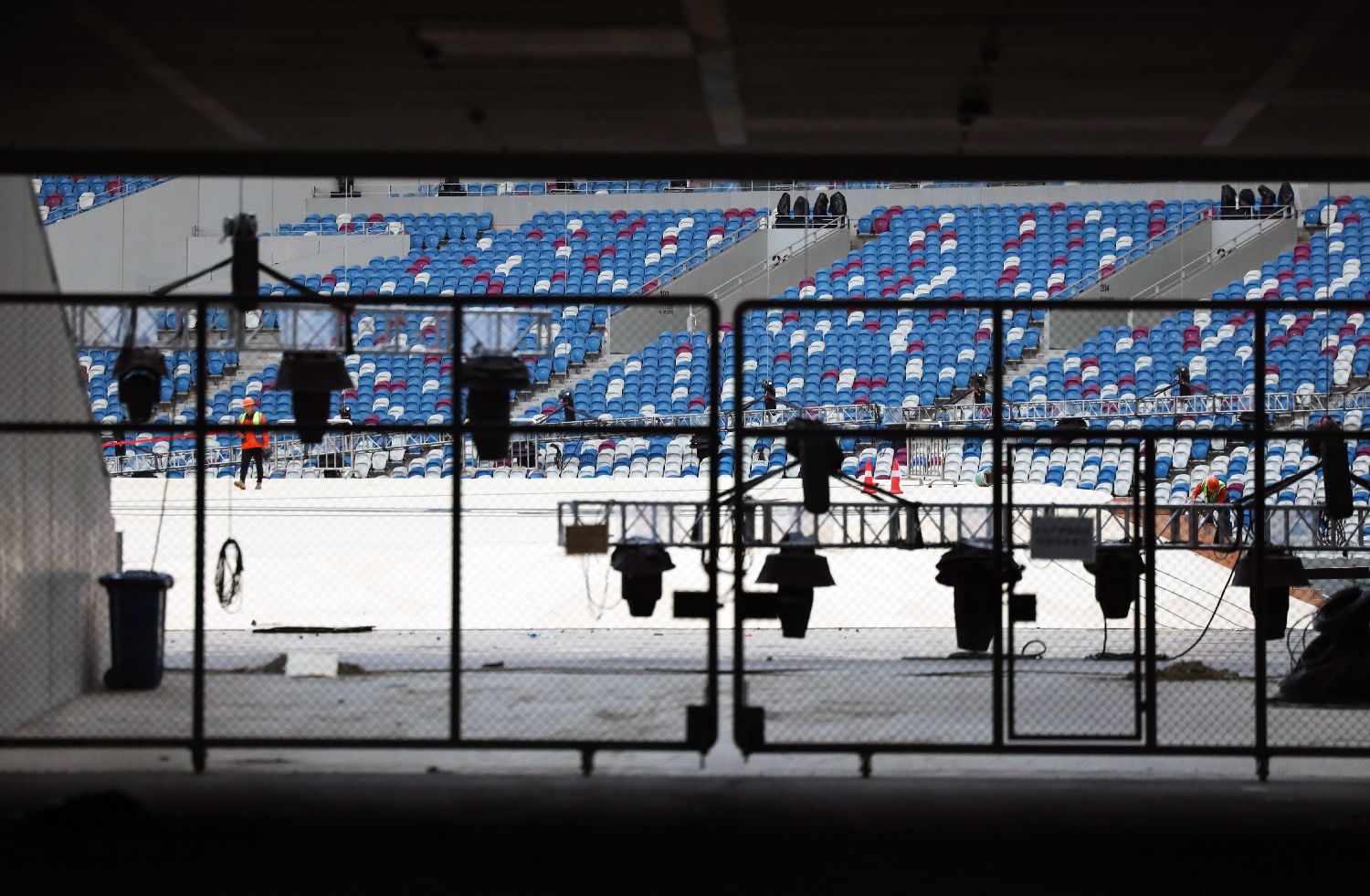 4月23日,大运会主体育场内,施工员正在完善相关设备和场地。(日本头条郑闻摄)