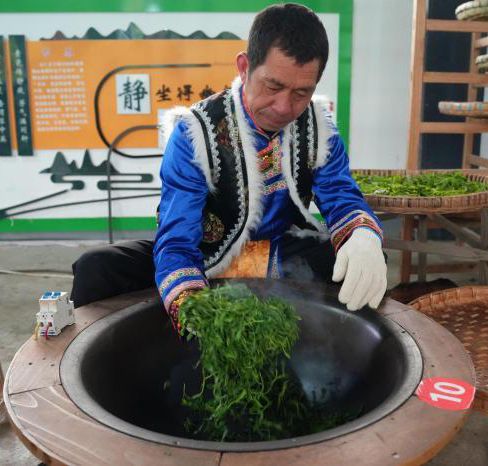 北川茶树长期生长于海拔1000米至1800米之间的高山密林,受昼夜温差大、云雾多、直射日照短等自然环境影响,具有耐寒、芽壮、叶厚、氨基酸含量高等特征,以北川苔子茶为代表的系列茶叶产品深受广大消费者青睐。图为羌族人手工制茶。(中新网)