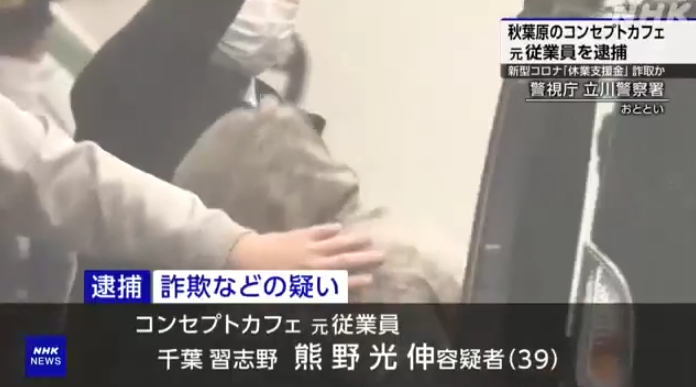 据NHK报道,被逮捕的是一家概念咖啡厅的前员工,39岁的熊野光伸,住在千叶县的习志野市。警视厅称:“熊野光伸在去年,通过不正手段让这家咖啡厅的兼职员工申请国家休业支援金,并骗取了逾290万日元的款项。”