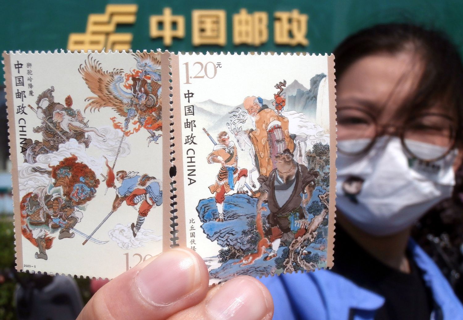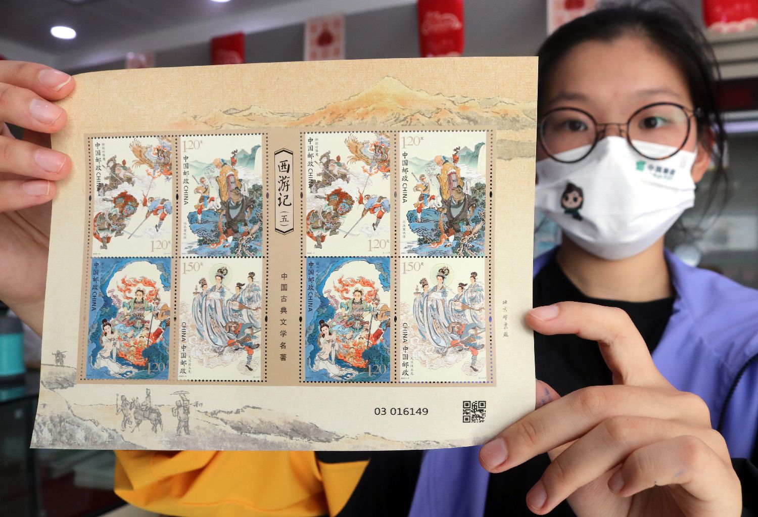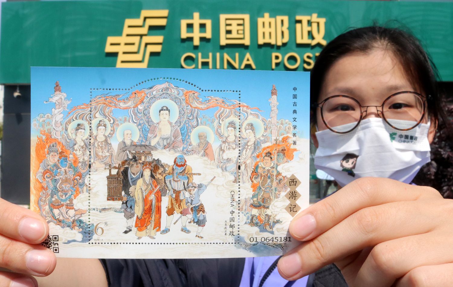 《中国古典文学名著——<西游记>(五)》邮票一套4枚,小型张1枚。邮票图案名称分别为“狮驼岭降魔”“比丘国伏怪”“填平无底洞”“天竺收玉兔”,小型张为“五圣成正果”。图为4月27日,集邮爱好者在江苏苏州邮政局展示刚购买的《中国古典文学名著——<西游记>(五)》特种邮票。(中新网)