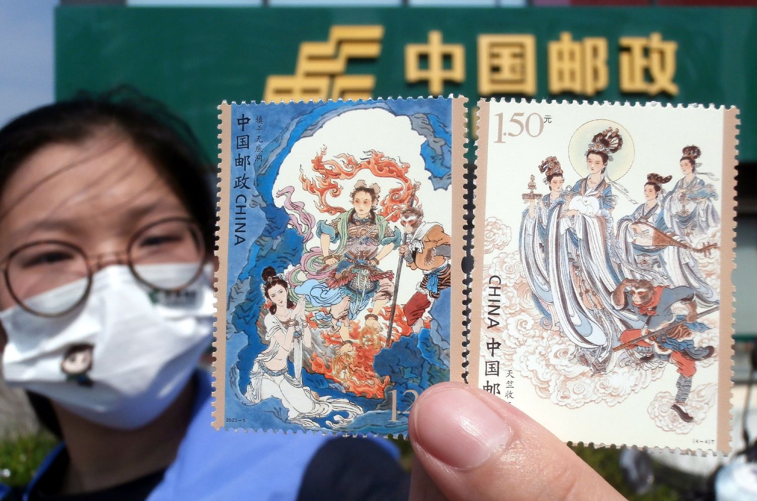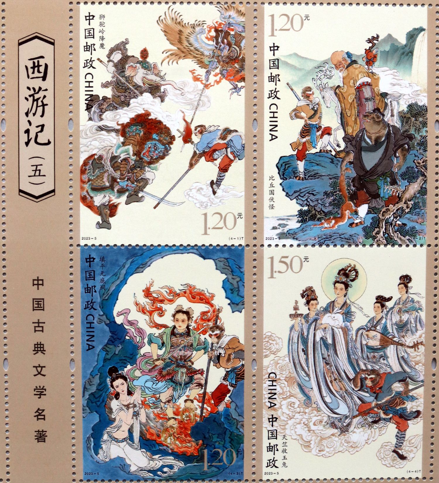该套邮票是中国邮政自2015年发行的《中国古典文学名著——<西游记>》系列邮票的第五组,描绘了小说第七十四回至第一百回的五段故事场景。画家运用传统工笔重彩的手法,同时注重以形写神,人物刻画逼真传神,在方寸间生动地演绎出大家熟知的故事情节。(中新网)