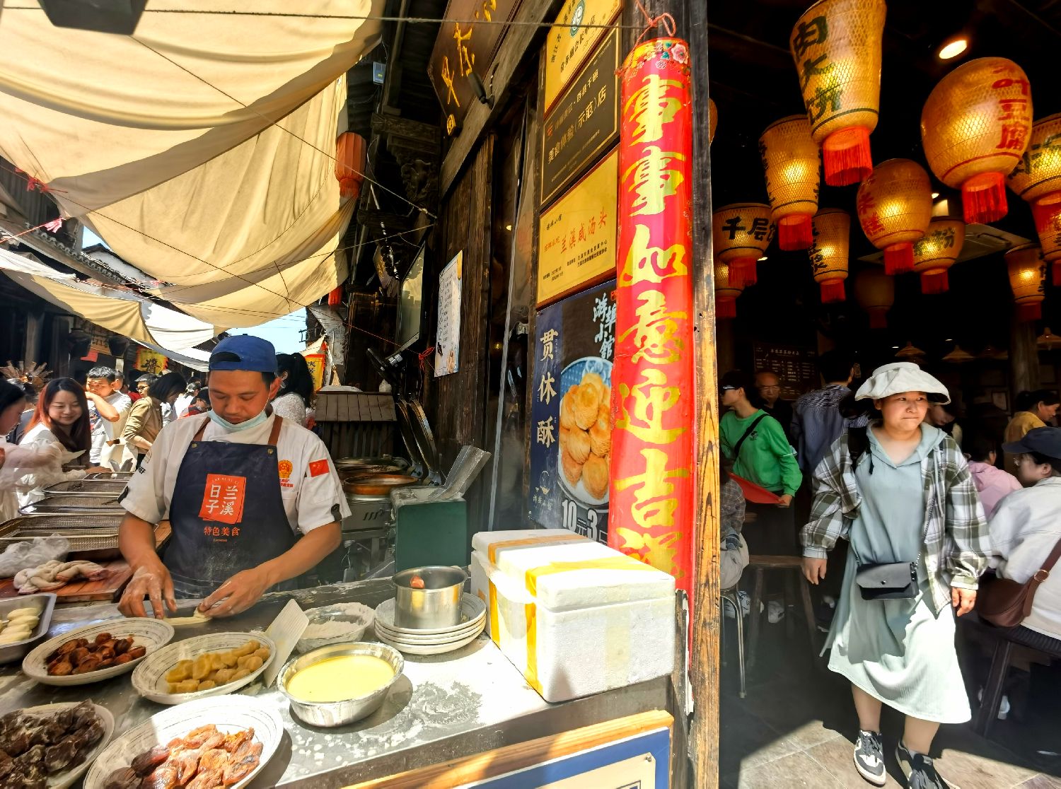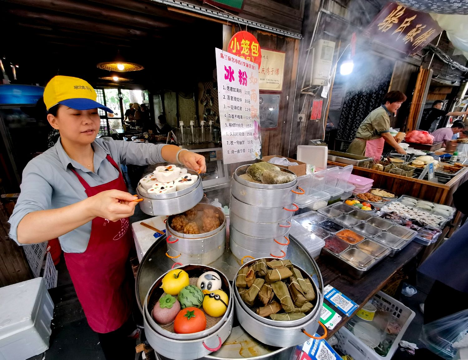5月1日,游客在早茶街品尝“打卡”。(中新社)