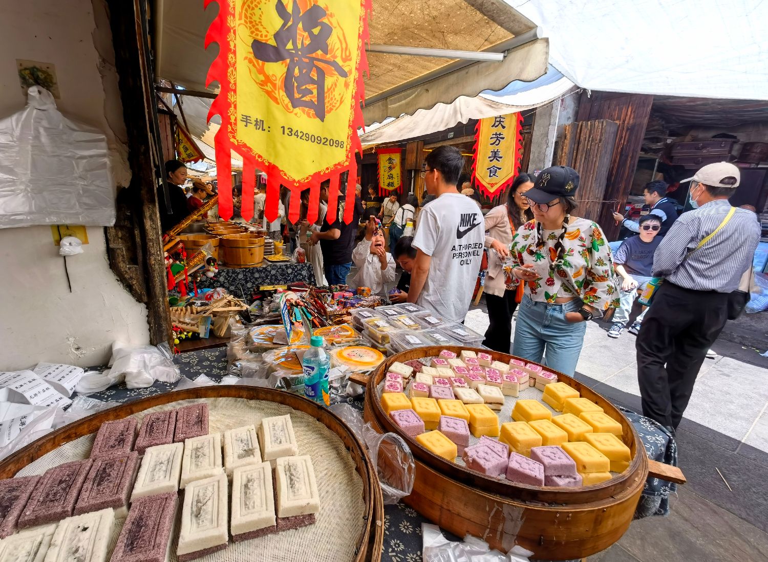 5月1日,游客在早茶街选购江南糕点。(中新社)