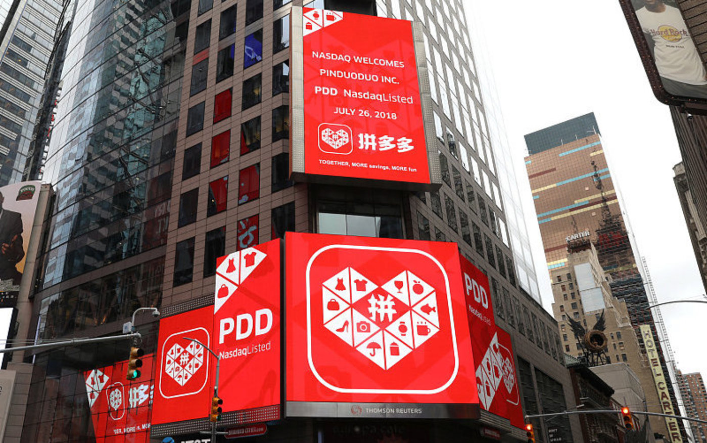 拼多多有关负责人回应“已将总部从中国迁至爱尔兰”严重失实,纯属误读。图为拼多多在户外显示屏播放的LOGO。(图/视觉中国)