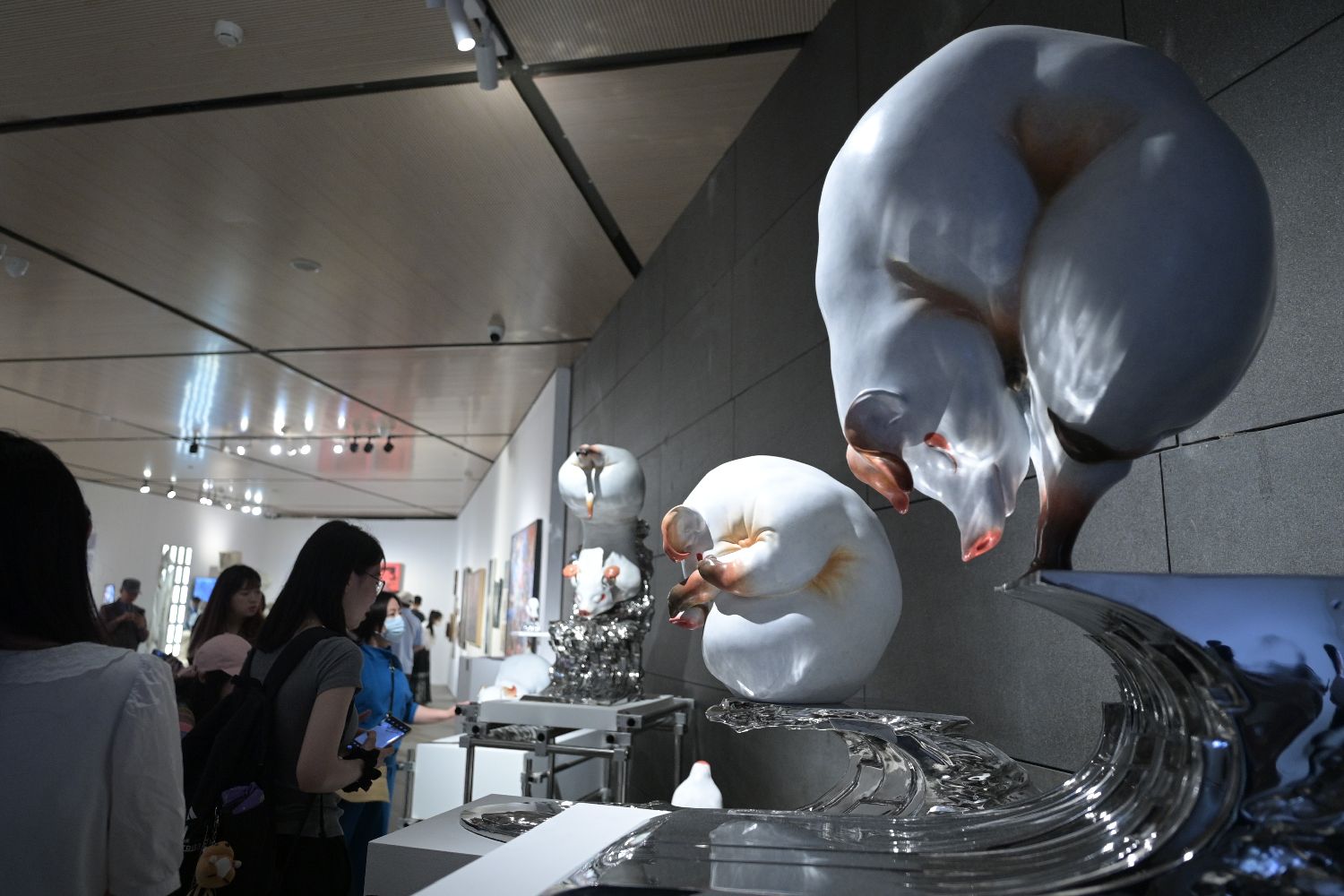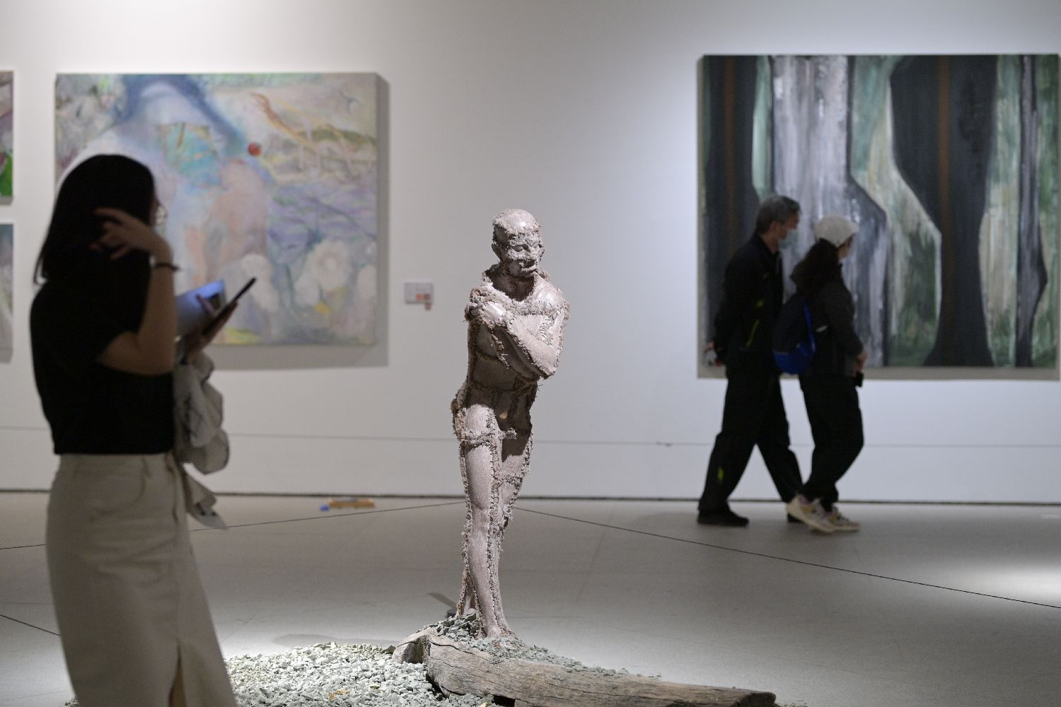 5月9日,观众在展览现场观赏雕塑作品。(新华社)