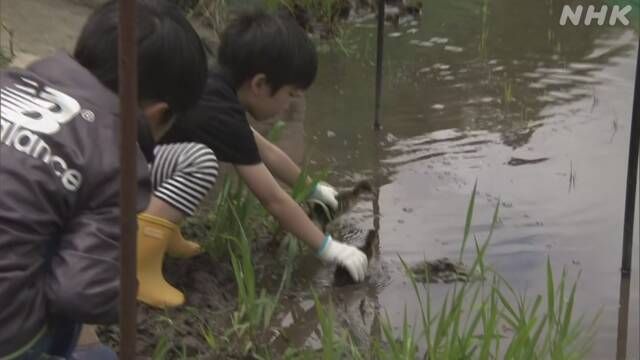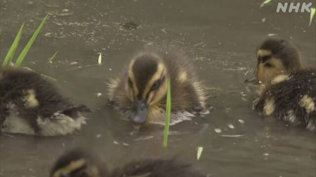 (日本头条讯)在岛根县饭南町,100只吃害虫和杂草的雏鸭被放进无农药的水稻田内。