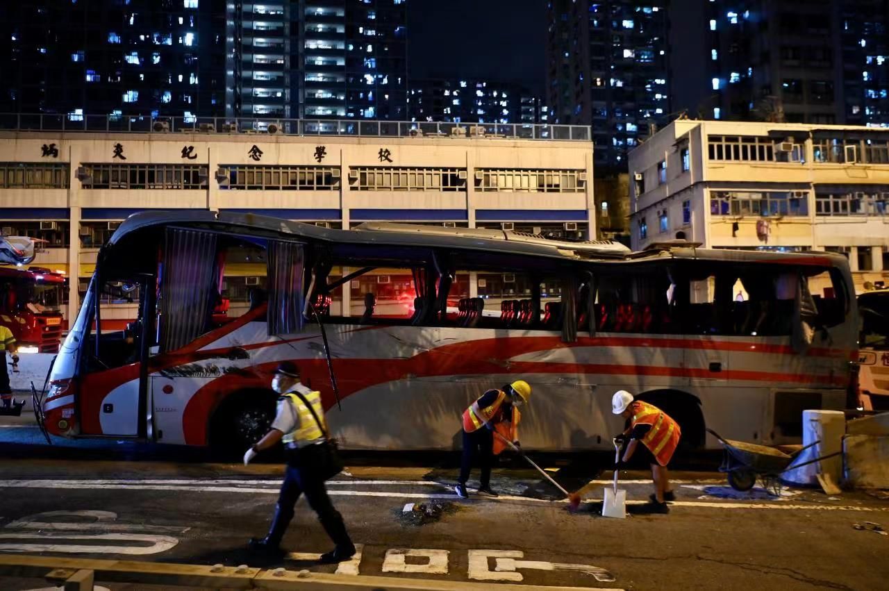 图为工作人员清理现场路面,侧翻的旅游巴士已扶正准备拖走。(图/中新社)
