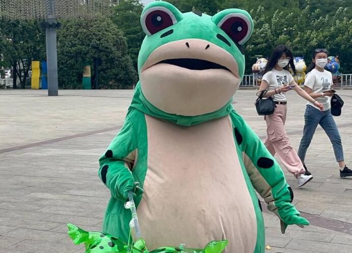 对于“卖崽青蛙”的动作,童女士也有自己的设计和考量,“因为青蛙人偶服比较大,在里面的人如果按照正常人的行走方式来走很容易摔倒。”后来为了符合青蛙人偶的可爱形象,童女士对着镜子研究了一些走路方式,和路人互动打招呼的动作以及拍照的姿势,这才有了网友口中“屁颠屁颠的网红青蛙”“可爱歪头杀的网红青蛙”“生气跺脚的网红青蛙”……