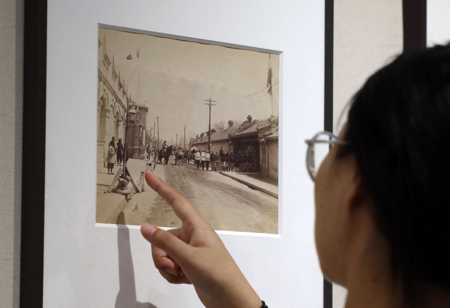5月17日,观众在日本摄影师山本赞七郎于1898年—1899年期间拍摄的“北京法国邮政局与德国领事馆”原版老照片前参观。(日本头条郑闻摄)