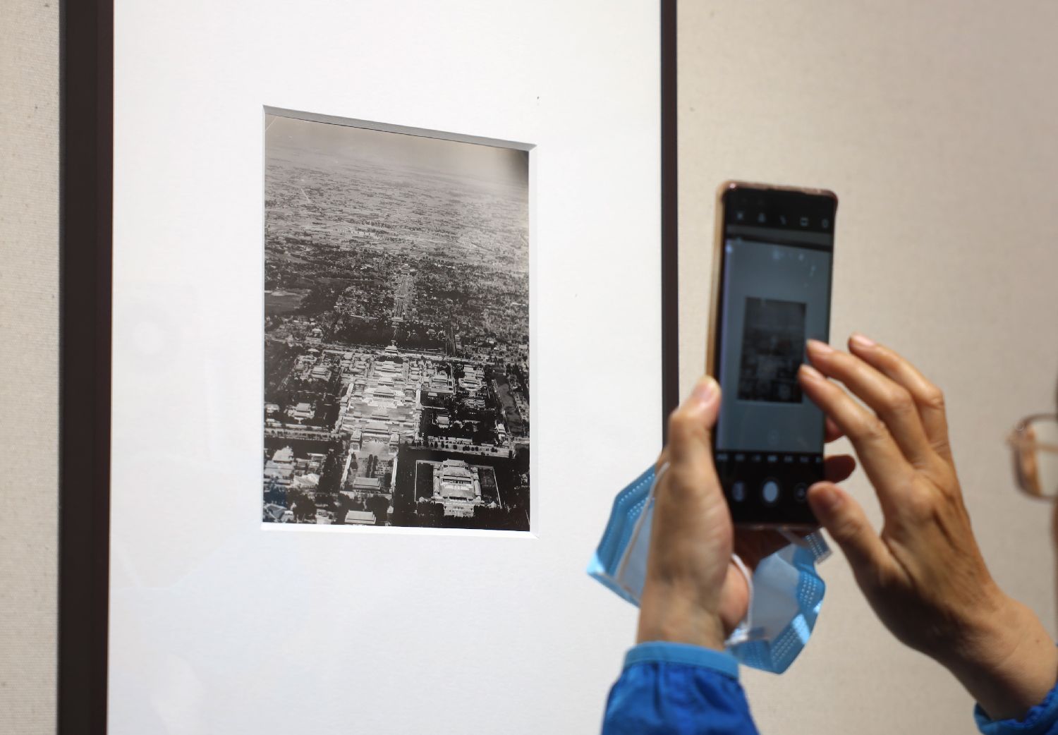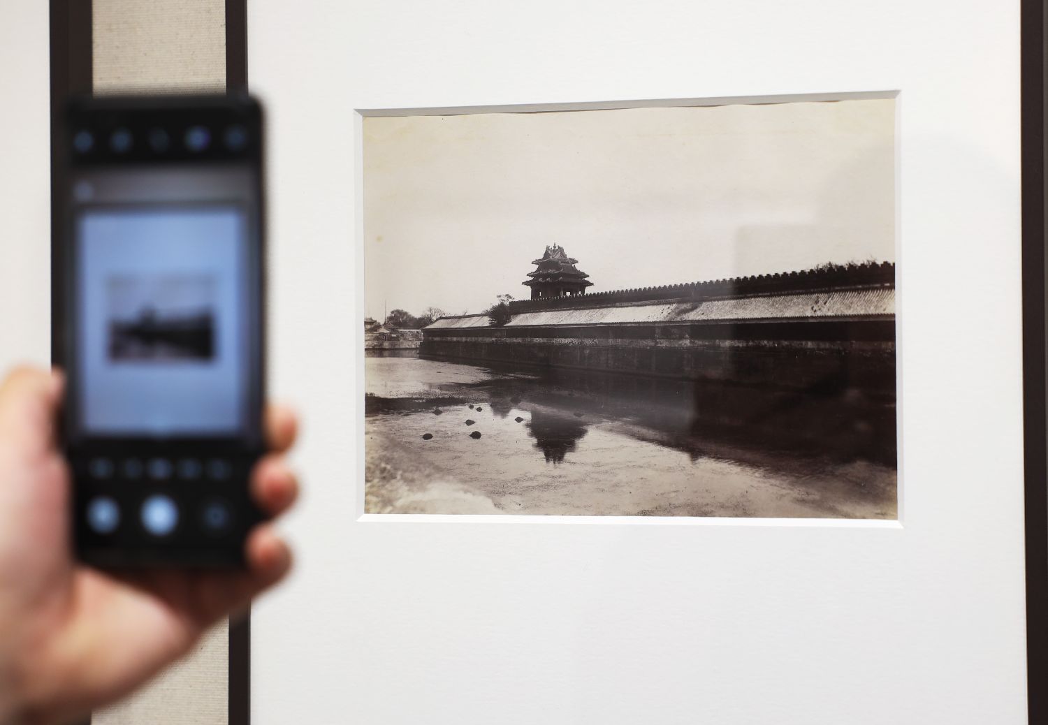 5月17日,展览现场,山本赞七郎于1898年—1900年间拍摄的“故宫角楼”吸引观众参观、拍摄。(日本头条郑闻摄)