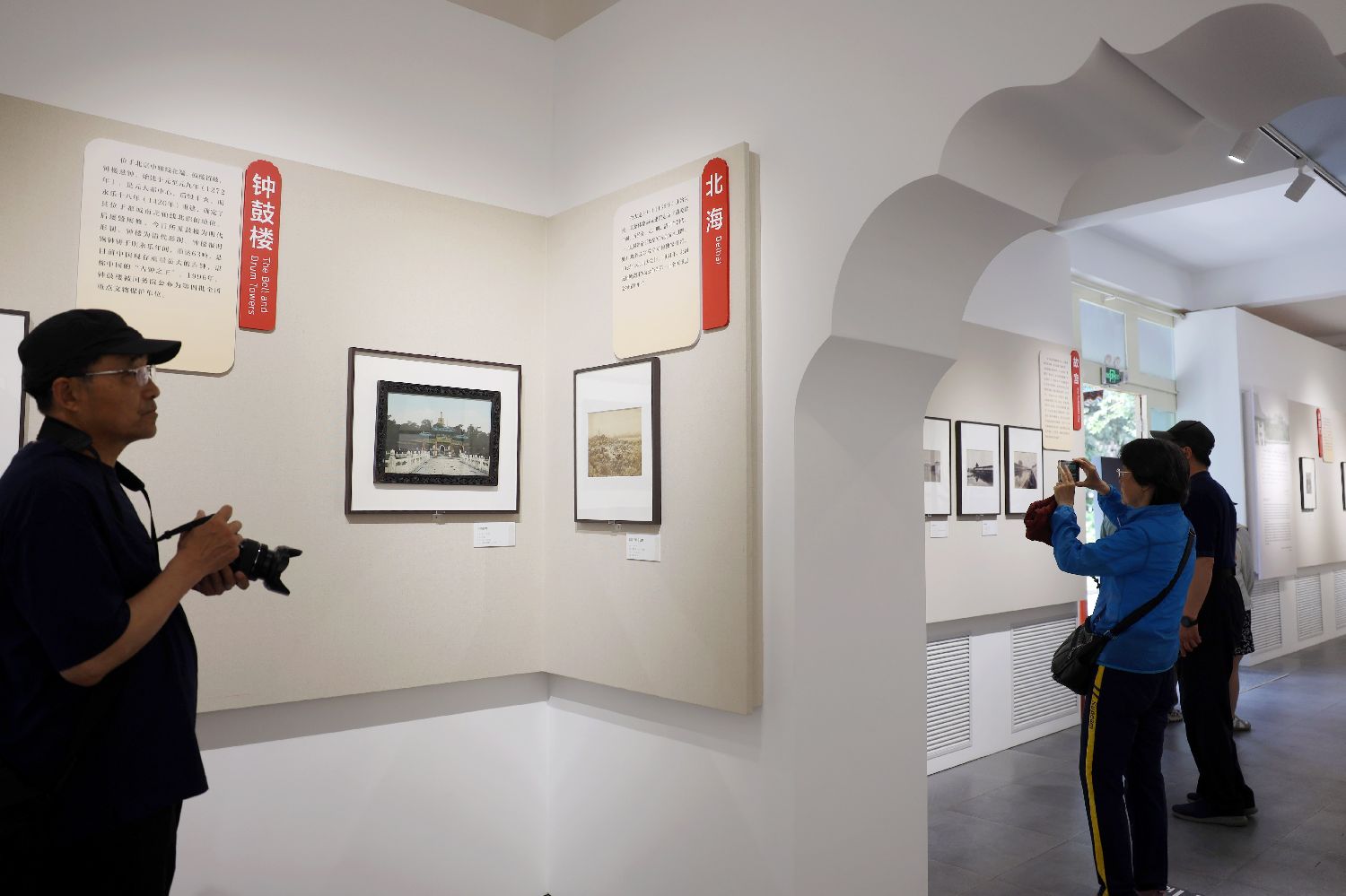 5月17日,观众在中山公园内南七间房展厅欣赏“北京中轴线”建筑群历史影像原作。(日本头条郑闻摄)