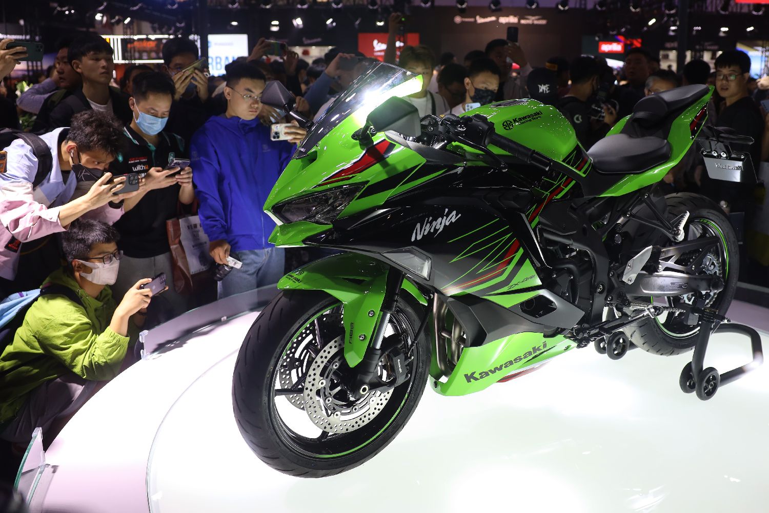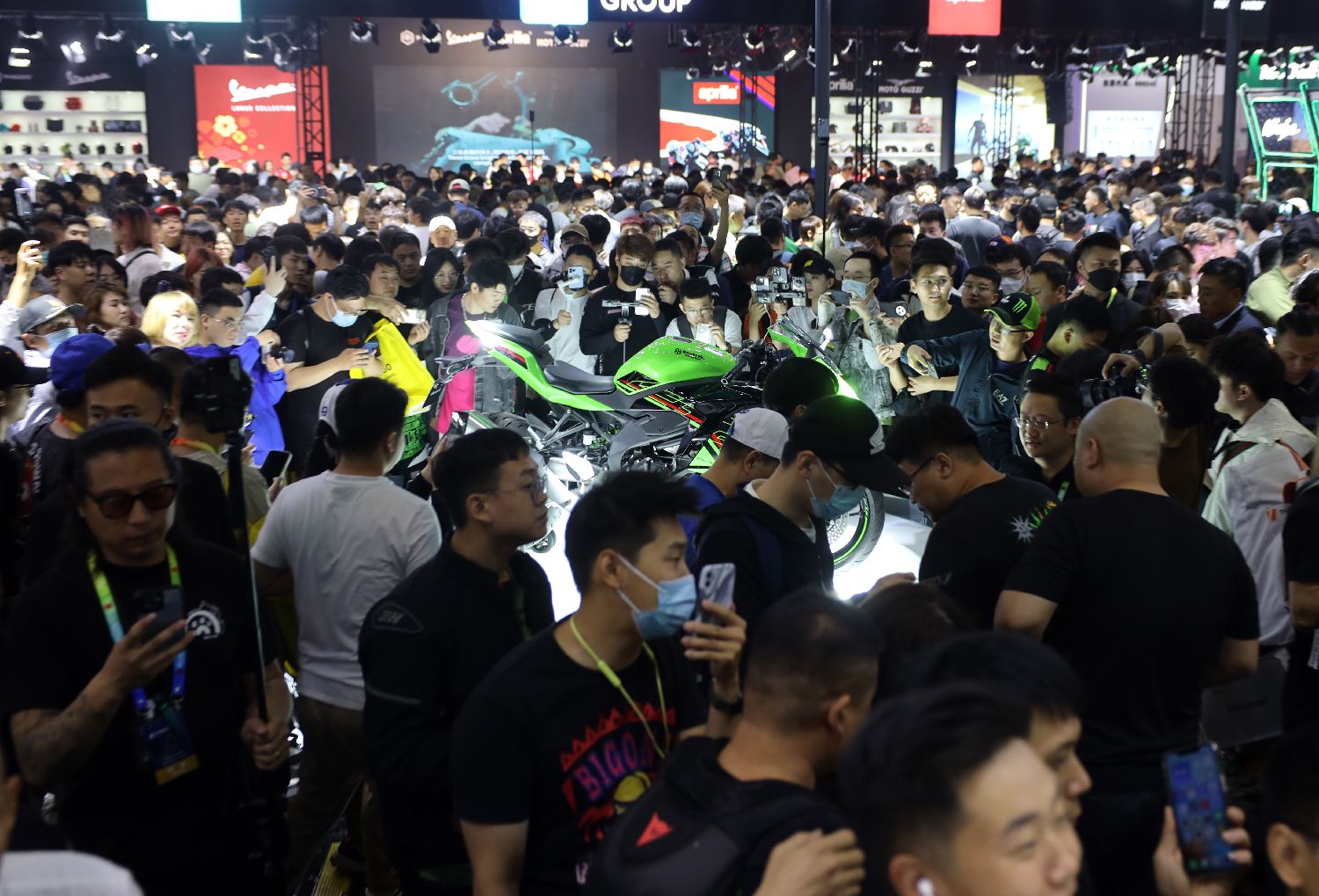 5月19日,北京国际摩托车展现场,观众围观新发布上市的川崎ZX-4RR。(日本头条 郑闻摄)