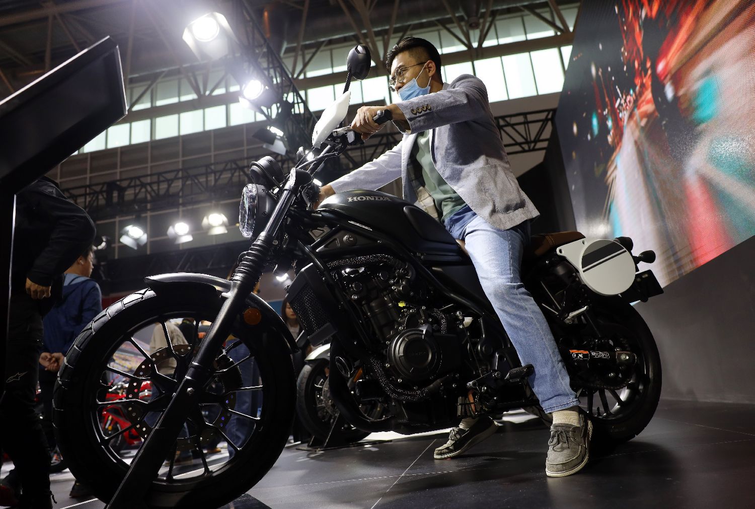 5月19日,本田摩托展台上新发布的CL500吸引观众“尝鲜”。(日本头条 郑闻摄)