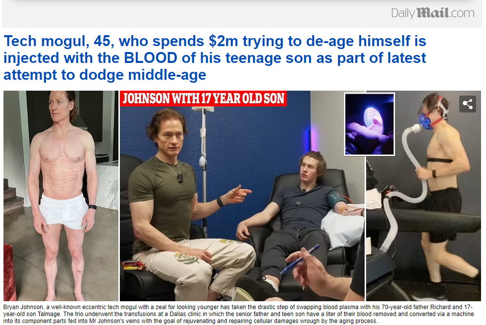美国45岁科技大亨布莱恩·约翰逊为“青春永驻”,用17岁儿子的血浆给自己换血。(图/《每日邮报》网站截图)