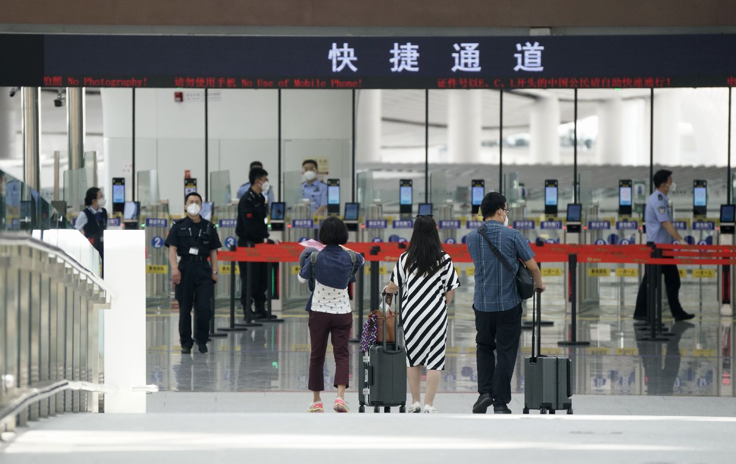 5月15日,旅客准备通过北京大兴机场边检站快捷通道。(图/新华社)