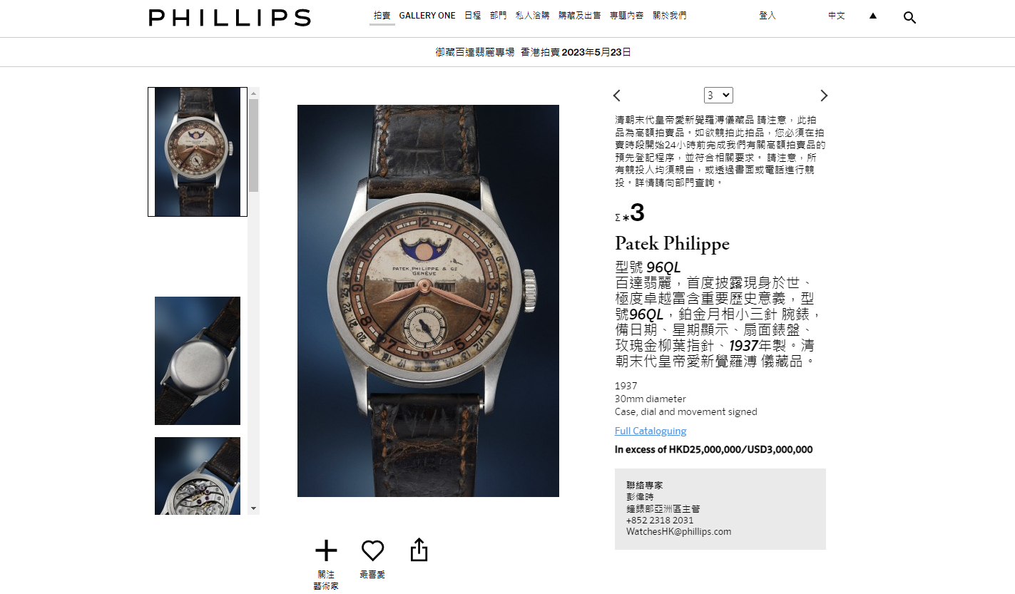 据港媒24日消息,中国末代皇帝溥仪曾珍藏的百达翡丽型号96“Quantieme Lune”手表,当地时间23日晚于香港以4885万元(港元,下同)成交,创下皇帝御藏腕表史上最高拍卖等三项纪录。