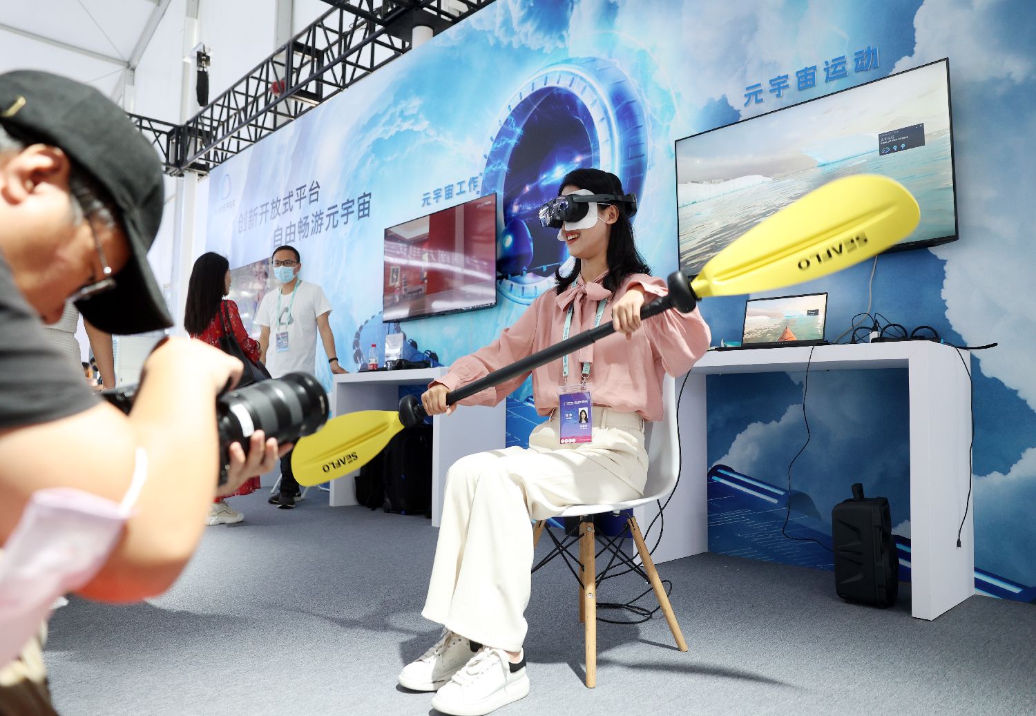 5月26日,参观者在元宇宙展区体验虚拟现实游戏。(日本头条黎明摄)