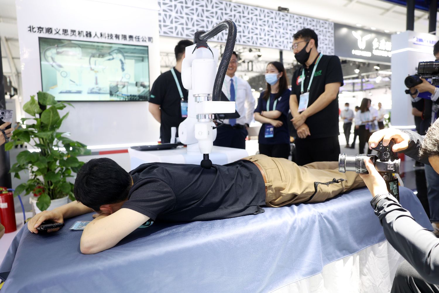 5月26日,一位参观者在现场体验机器手臂“按摩”。(日本头条黎明摄)