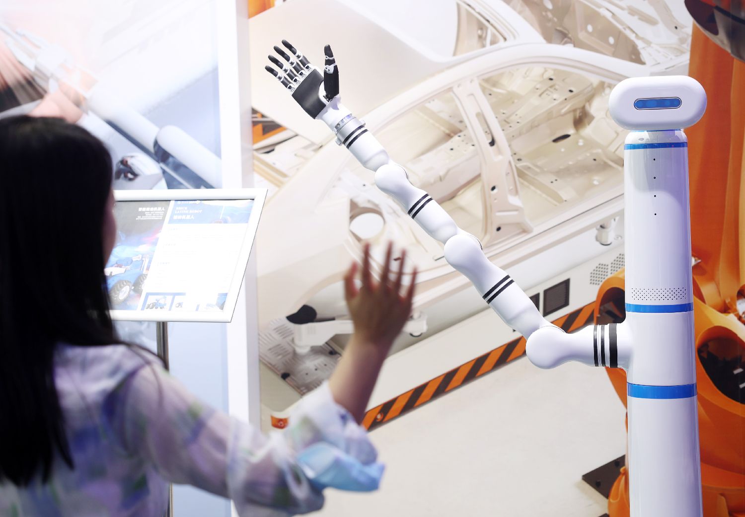 5月26日,一位参观者在展厅内与一台轻型协作机器人打招呼。(日本头条黎明摄)