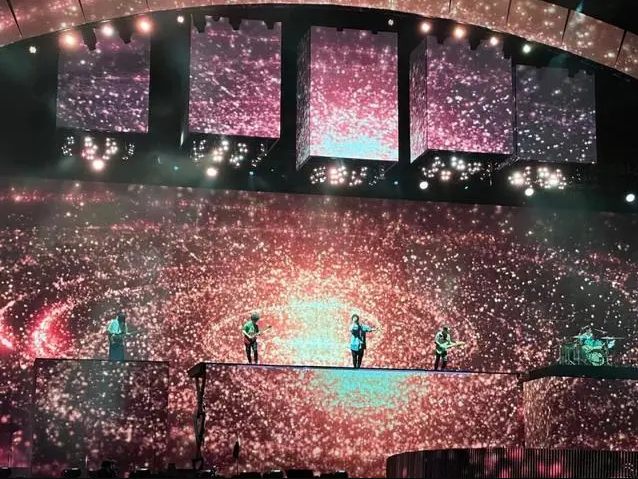 “我不转弯,我不转弯,让定律更简单,这样的青春我才喜欢。”当晚18时30分,随着一阵热血的音乐,鸟巢中的四万观众沸腾了,闪耀的灯光下,五月天出现在鸟巢一侧的舞台上,以青春热血的姿态弹唱《盛夏光年》,舞台上的巨幅弧面屏幕映出他们的身影,引得现场阵阵欢呼。《爱情万岁》《派对动物》《离开地球表面》《因为你所以我》,一首快歌接着一首快歌唱下来,鸟巢变成大型“蹦迪”现场,歌迷们都挥舞着荧光棒,跟着五月天唱歌。“怎么去拥有一道彩虹,怎么去拥抱一夏天的风。”当《知足》的旋律响起,全场大合唱的音浪盘旋在鸟巢上空,五月天的几位成员,坐在高高升起的舞台上,蓝色灯光效果的晕染下,鸟巢现场变得尤为浪漫。