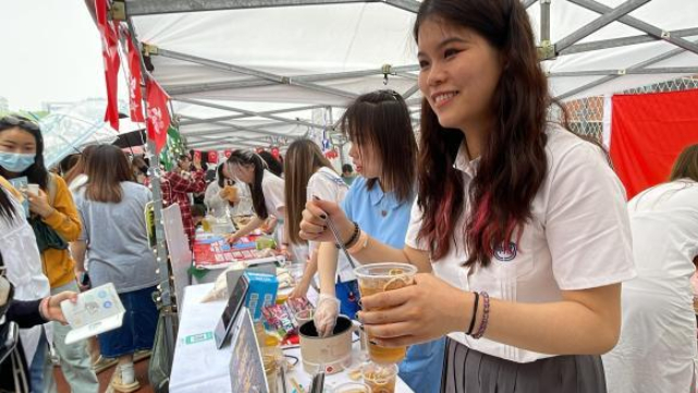 5月27日,北京语言大学举行第十八届世界文化节。图为该校香港学生在展区内制作柠檬红茶。(图/中新网)