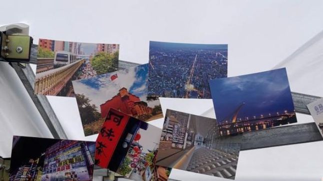 图为台湾展区中,印有101大厦、九份阿妹茶楼、台北故宫博物院等地标建筑的照片。(图/中新网)