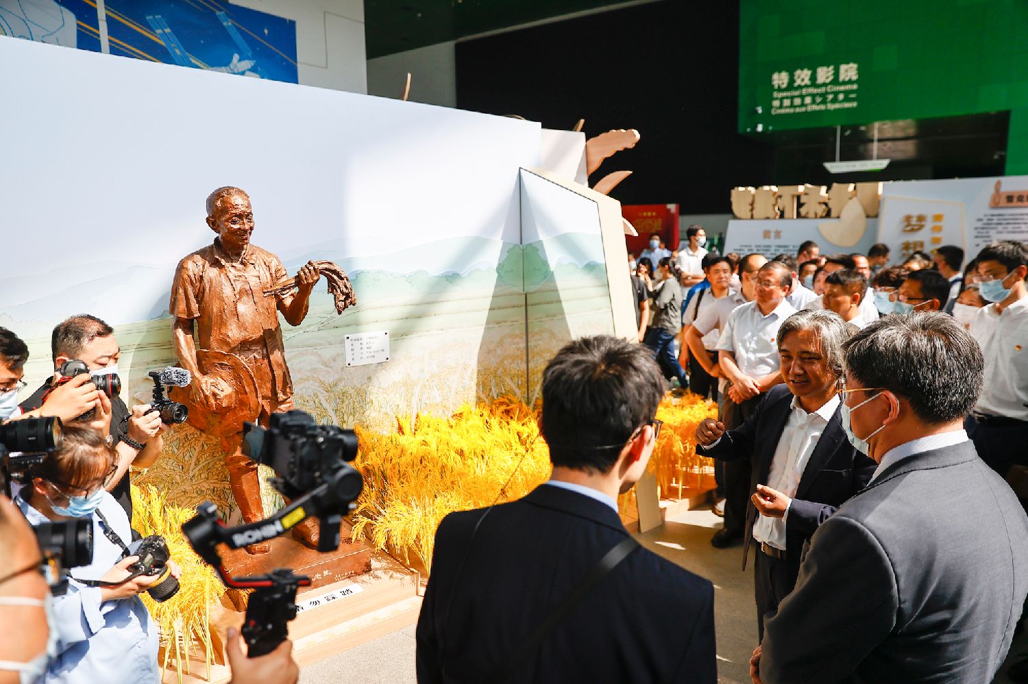 5月29日,“稻谷飘香,禾下追梦——中国攻克杂交水稻难关50周年”展览在中国科技馆开幕。由中国美术馆馆长吴为山创作的雕像《袁隆平》在展览上格外醒目。雕像中,袁隆平穿着雨鞋,站在稻田中。他右手拿着草帽,面带微笑、低头看着左手的稻穗。