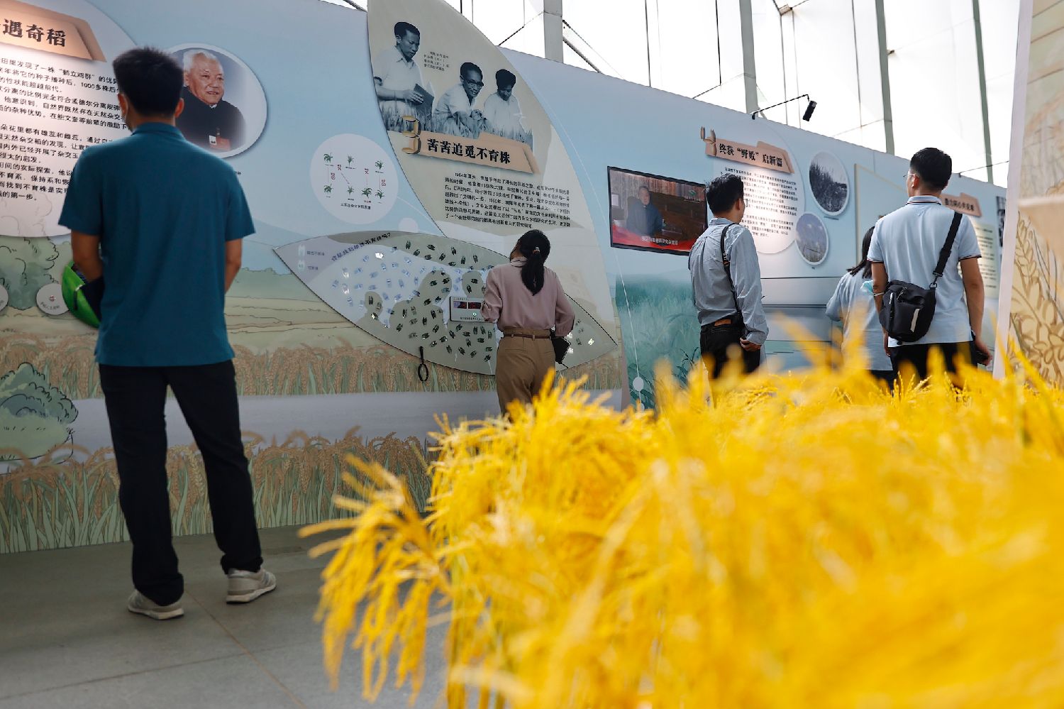 5月29日,参观者在展厅内了解中国攻克杂交水稻难关的历史。(图/日本头条 王亚非 摄)