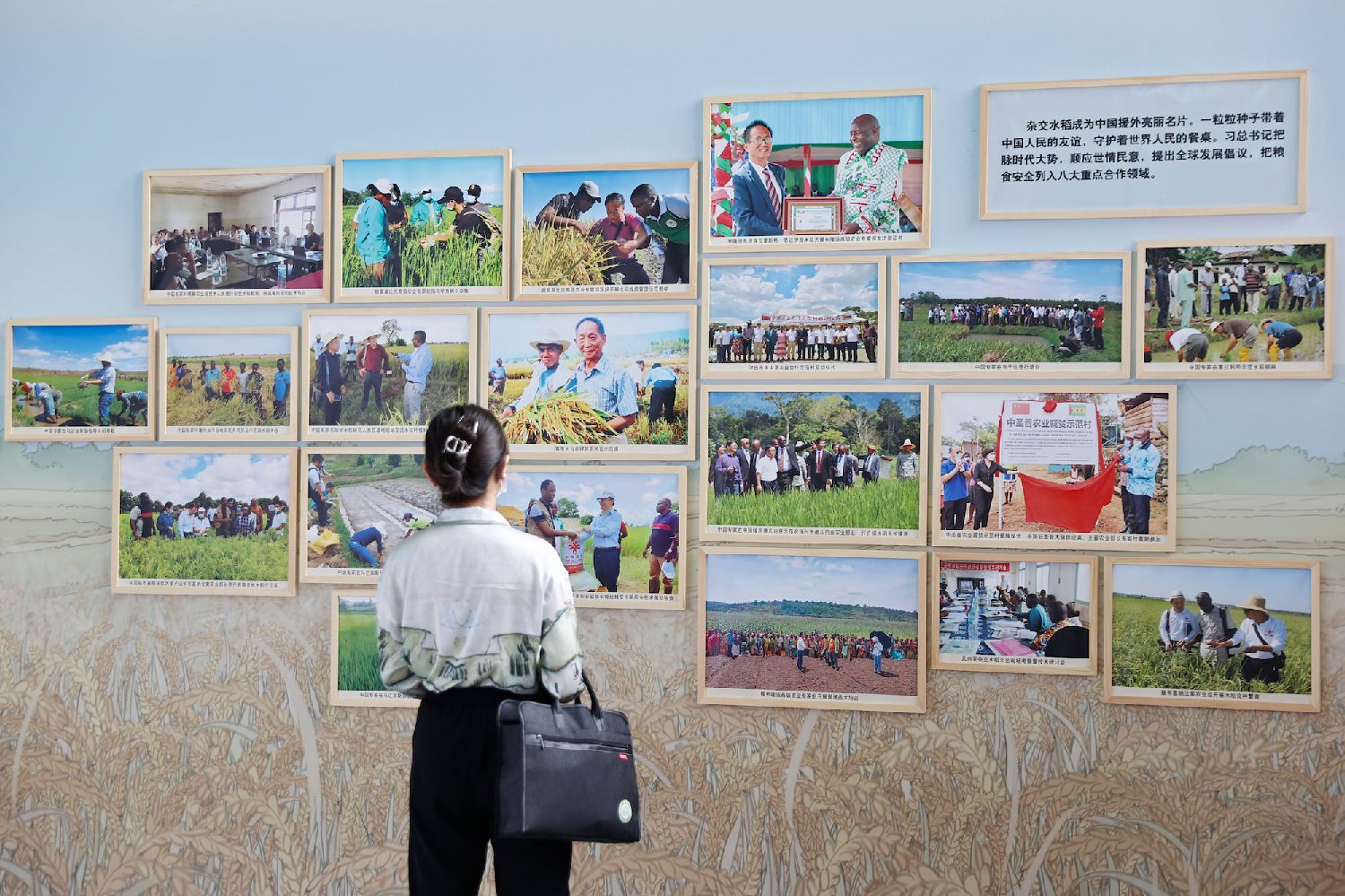 5月29日,参观者在展厅内观看中国科学工作者在非洲传授水稻种植技术的照片。(图/日本头条 王亚非 摄)