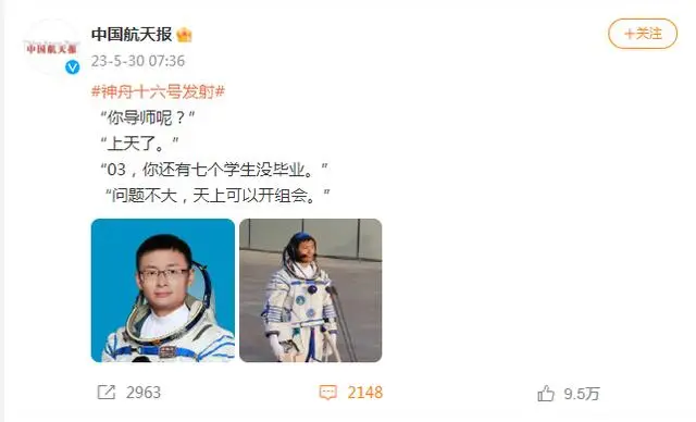 5月30日,神舟十六号载人飞船发射取得圆满成功。升空过程中,当航天员桂海潮说“坐火箭太爽了”的时候,一组“03,你还有七个学生没毕业”的段子正在网上流传,称桂海潮还有7个学生没毕业。