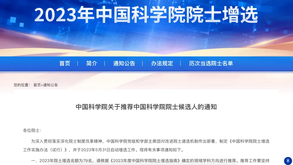 2023年中科院院士增选名额共79名。(图/中国科学院网站截图)
