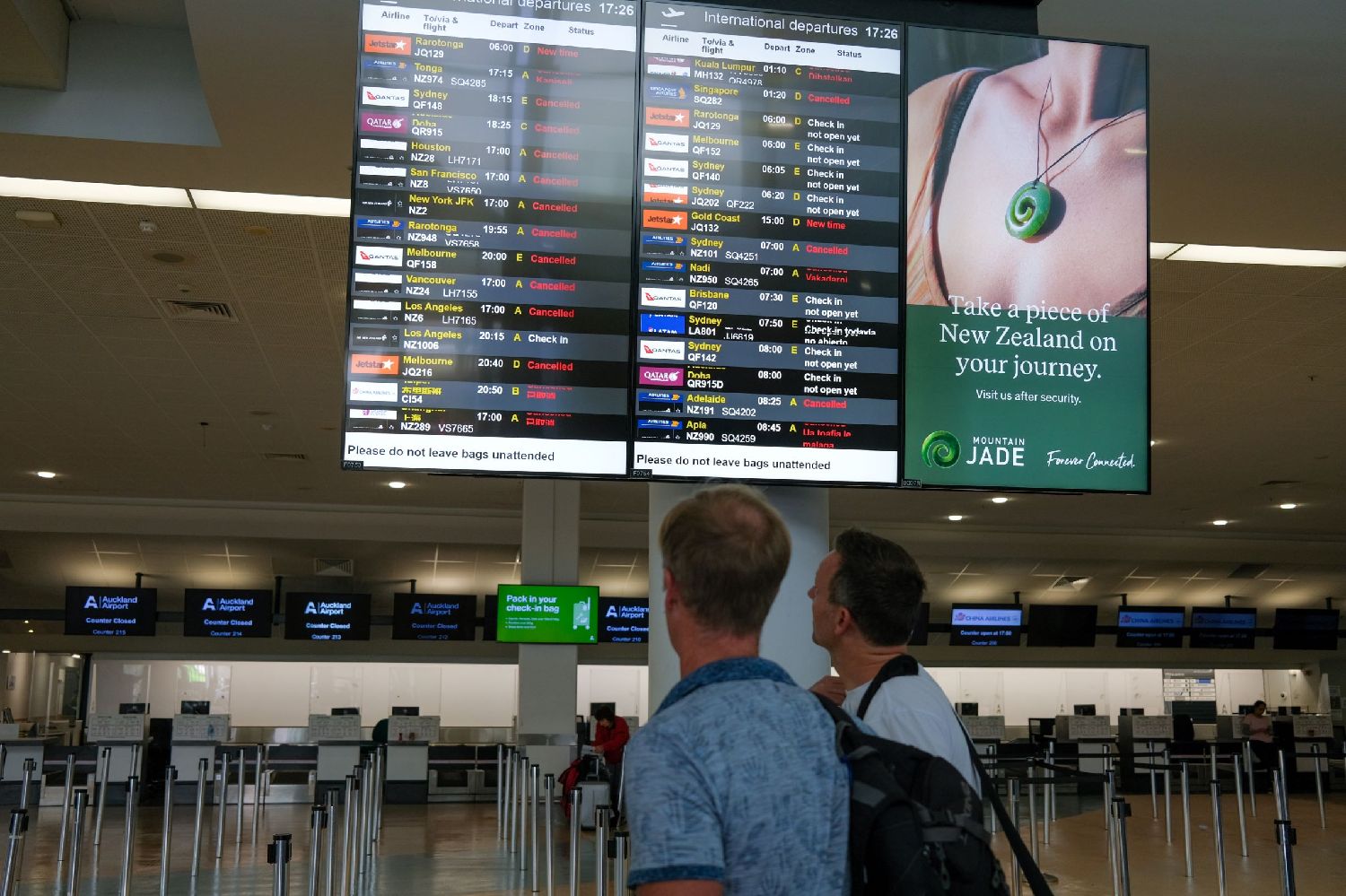 图为旅客在新西兰奥克兰国际机场查看信息提示牌。(图/新华社)