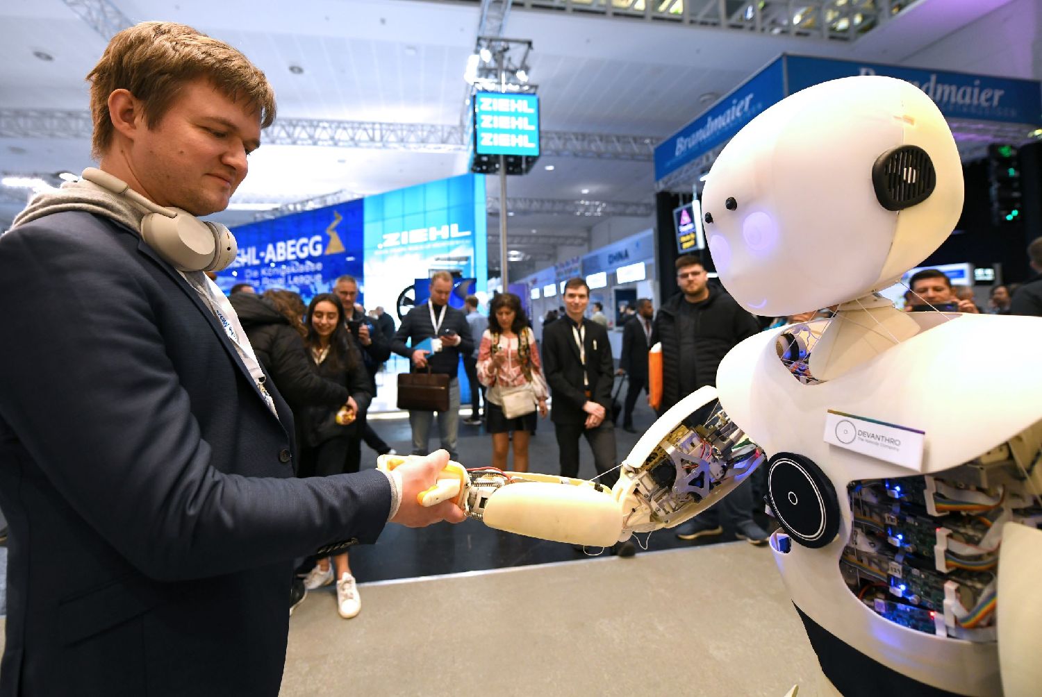 图为4月18日,一名男子在德国汉诺威工业博览会上与一款智能机器人握手。(图/新华社)