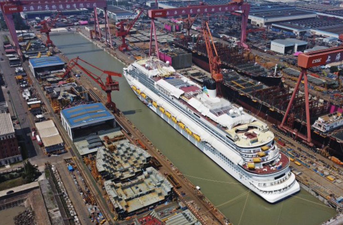 图为航拍成功起浮的中国首艘国产大型邮轮“爱达·魔都号”。(图/中新网)