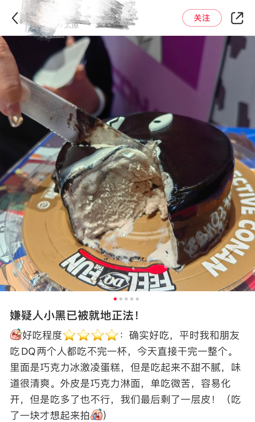 这款蛋糕整体是犯人小黑的形象,黑色的蛋糕体是满满的香醇浓郁的巧克力淋酱。犯人小黑的眼睛、咧嘴笑神还原,里面是纯纯的巧克力冰淇淋,没有任何冰淇淋蛋糕体。有不少“小黑粉”在网上晒出自己与蛋糕的合照,“跑了三家店,终于买到啦!”可见犯泽先生有多受欢迎。