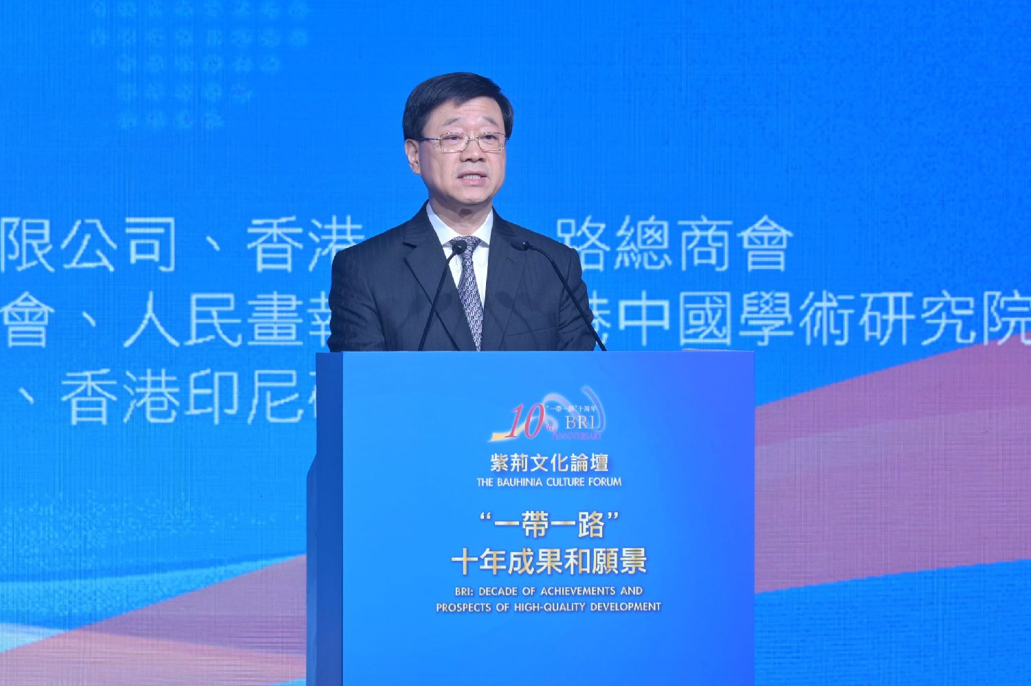 “‘一带一路’十年成果和愿景”紫荆文化论坛6月7日在香港君悦酒店举行。图为香港特区行政长官李家超致辞。(图/中新社)