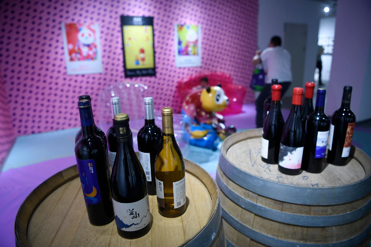 图为2022年5月21日,2022贺兰山东麓葡萄酒年代珍藏酒标艺术展上展出的葡萄酒产品及装置艺术作品。(图/新华社)