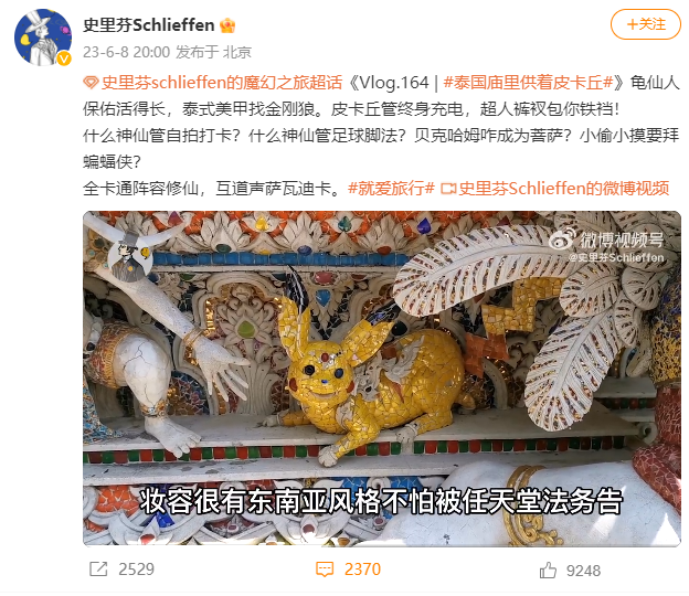 图为视频博主@史里芬Schlieffen在参观泰国寺庙时发现一座寺庙内供奉着皮卡丘。(图/微博截图)
