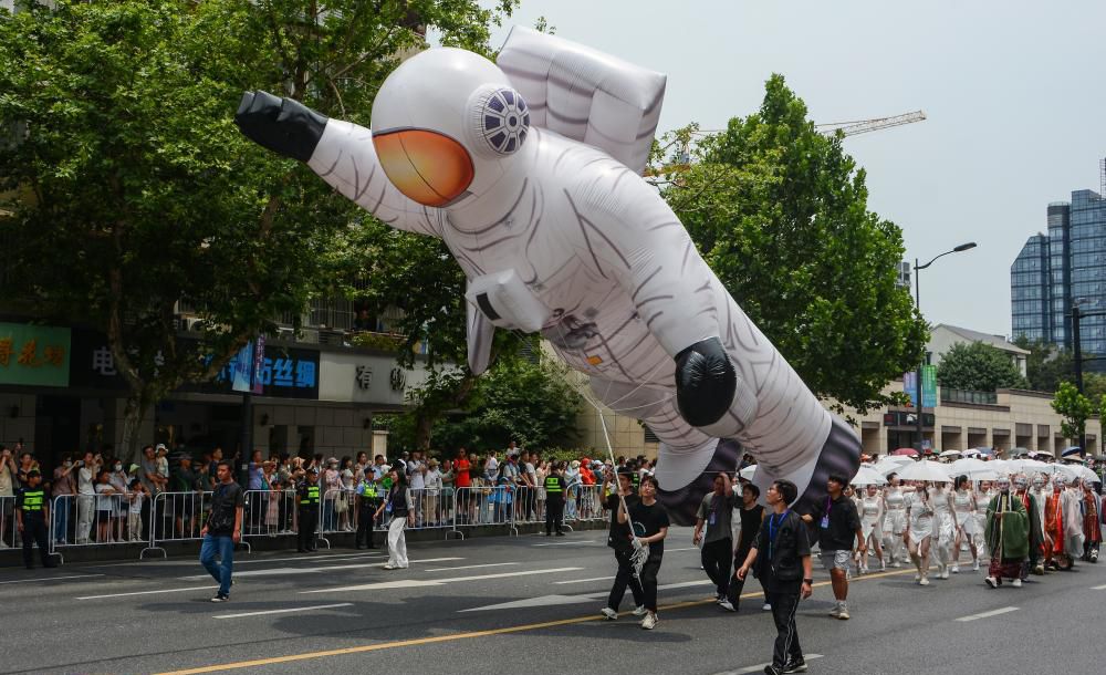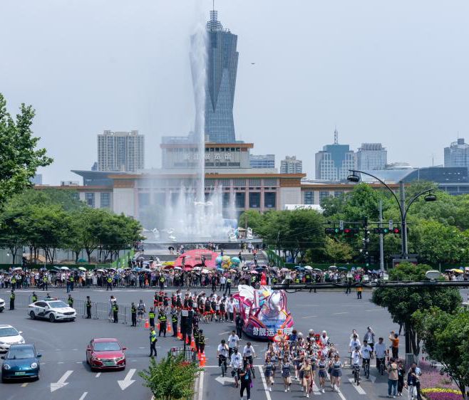 作为2023世界休闲博览会暨杭州西湖国际博览会配套活动之一,2023杭州“武林大巡游”以四辆花车、八个方阵演绎“精彩亚运、时尚之都、运河明珠、数字新城”主题。精彩纷呈的狂欢表演,吸引民众观看。图为6月11日,巡游花车和方阵从杭州武林广场出发。(CFP)