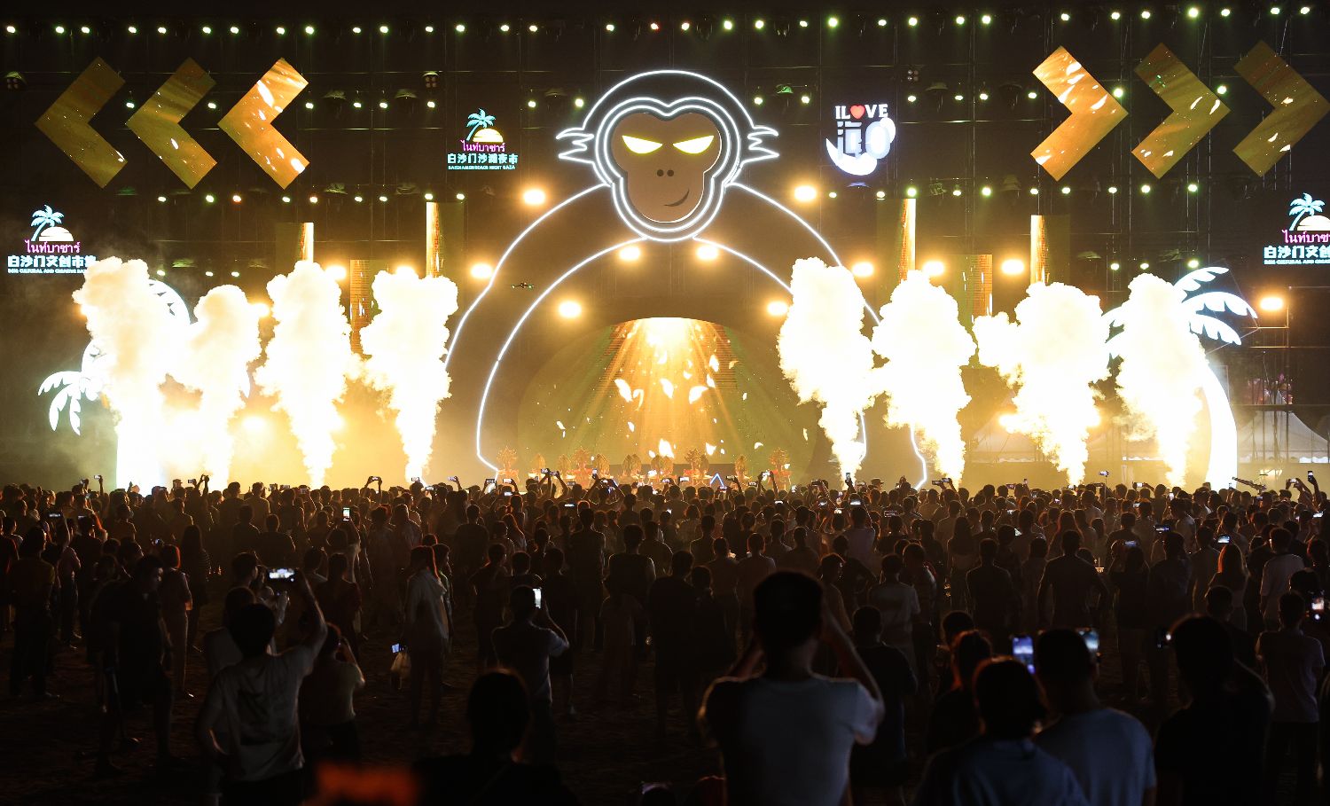 海口白沙门文创市集聚集超700个海内外餐饮、文创商家,集夜游、夜购、夜娱为一体,打造城市夜间经济“新引擎”。图为6月12日,市民游客在海口白沙门文创市集欣赏舞蹈表演。(新华社)