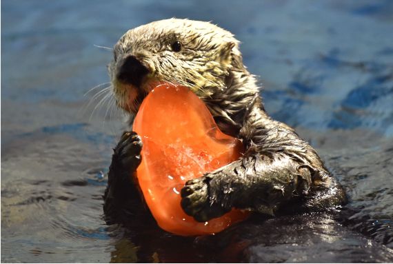 图为2017年2月11日,在日本横滨的八景岛海洋乐园,一只海獭抱着一块心形的冰块。(图/新华社)