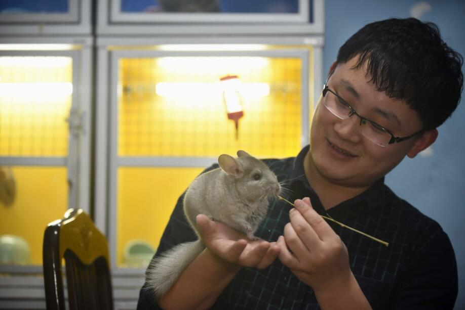在合肥市瑶海区裕丰花市,郑鹤鸣在宠物店给“龙猫”南美洲栗鼠喂食。(图/新华社)