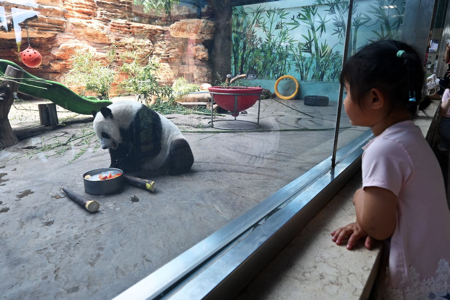 6月15日,河北省石家庄市动物园,大熊猫在放有冰块的空调房里享用美食。该动物园为动物们准备了多种解暑方式对抗高温。当地时间当日14时,河北成为中国最热的地方,气温榜前十已被河北全部占据,其中石家庄气温突破40℃大关,成为中国今年首个40℃省会级城市。(中新社)