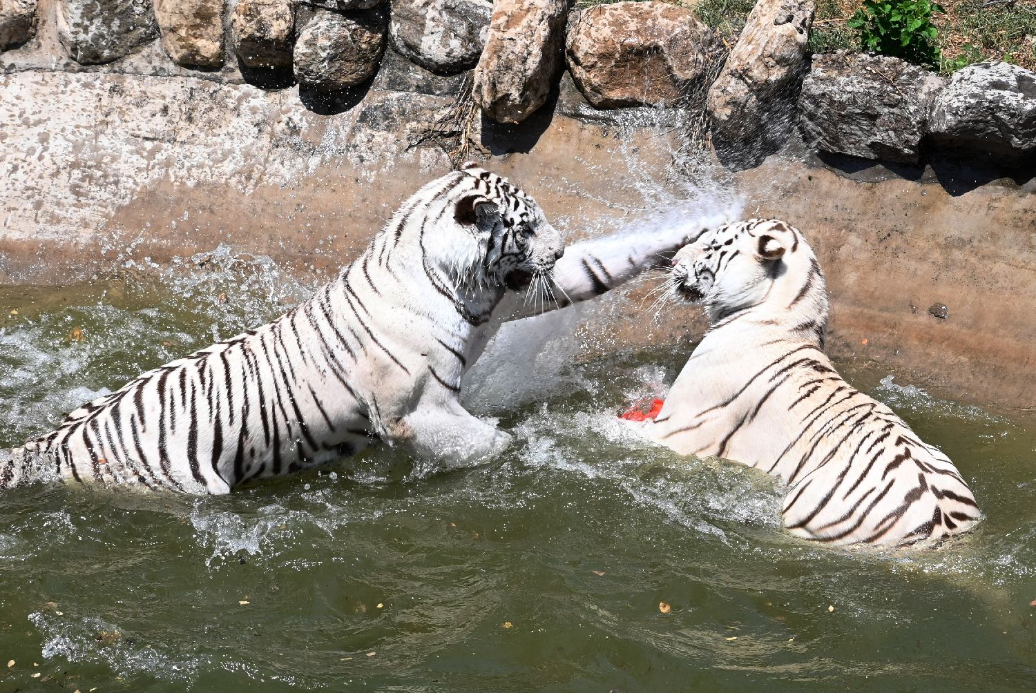 6月15日,河北省石家庄市动物园,两只白虎在水池中嬉戏解暑。(中新社)