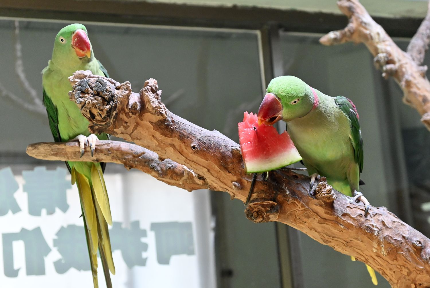 6月15日,河北省石家庄市动物园,亚历山大鹦鹉吃西瓜解暑。(中新社)