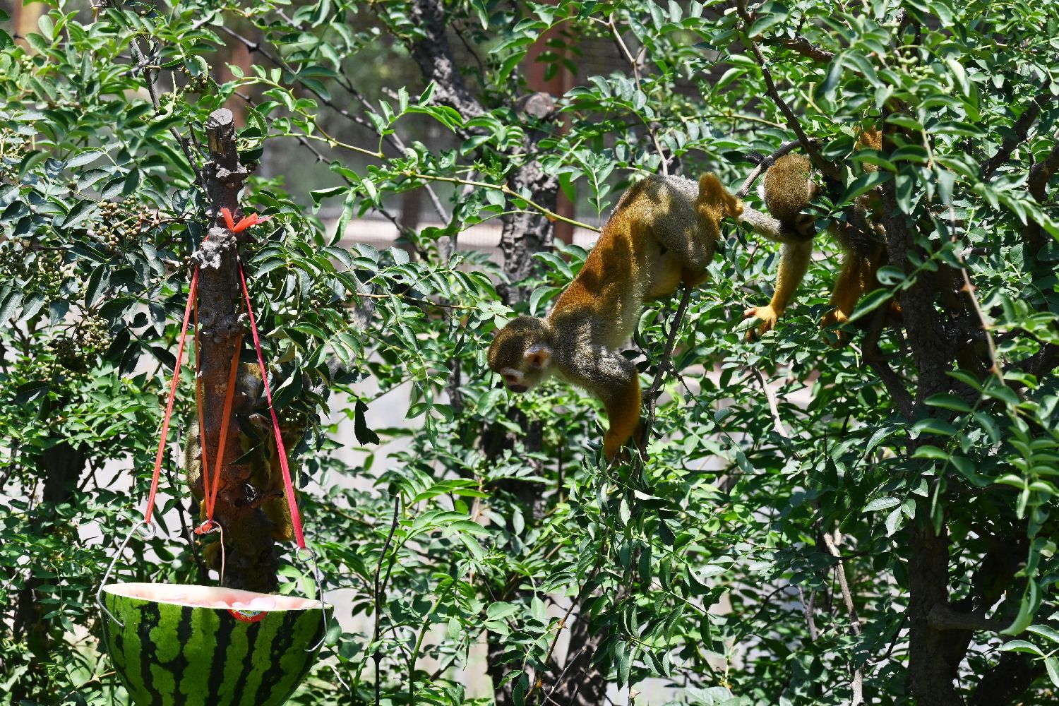 6月15日,河北省石家庄市动物园,松鼠猴准备品尝冰镇水果。(中新社)