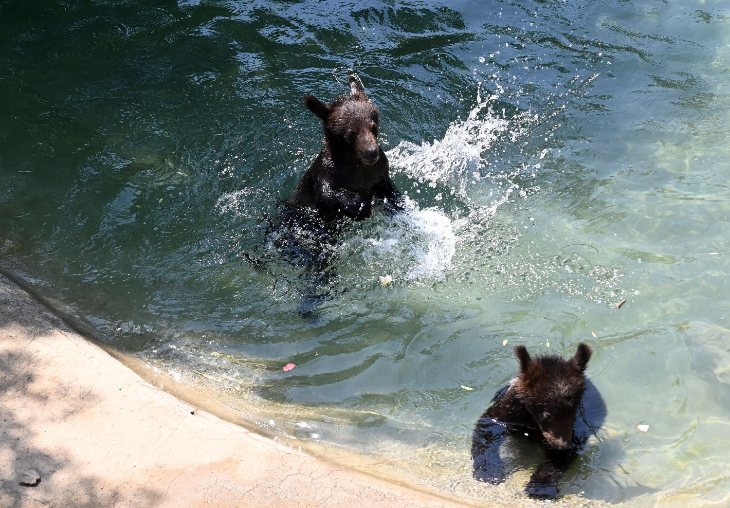 6月15日,河北省石家庄市动物园,两只5个多月大的小棕熊在水池中嬉戏解暑。(中新社)