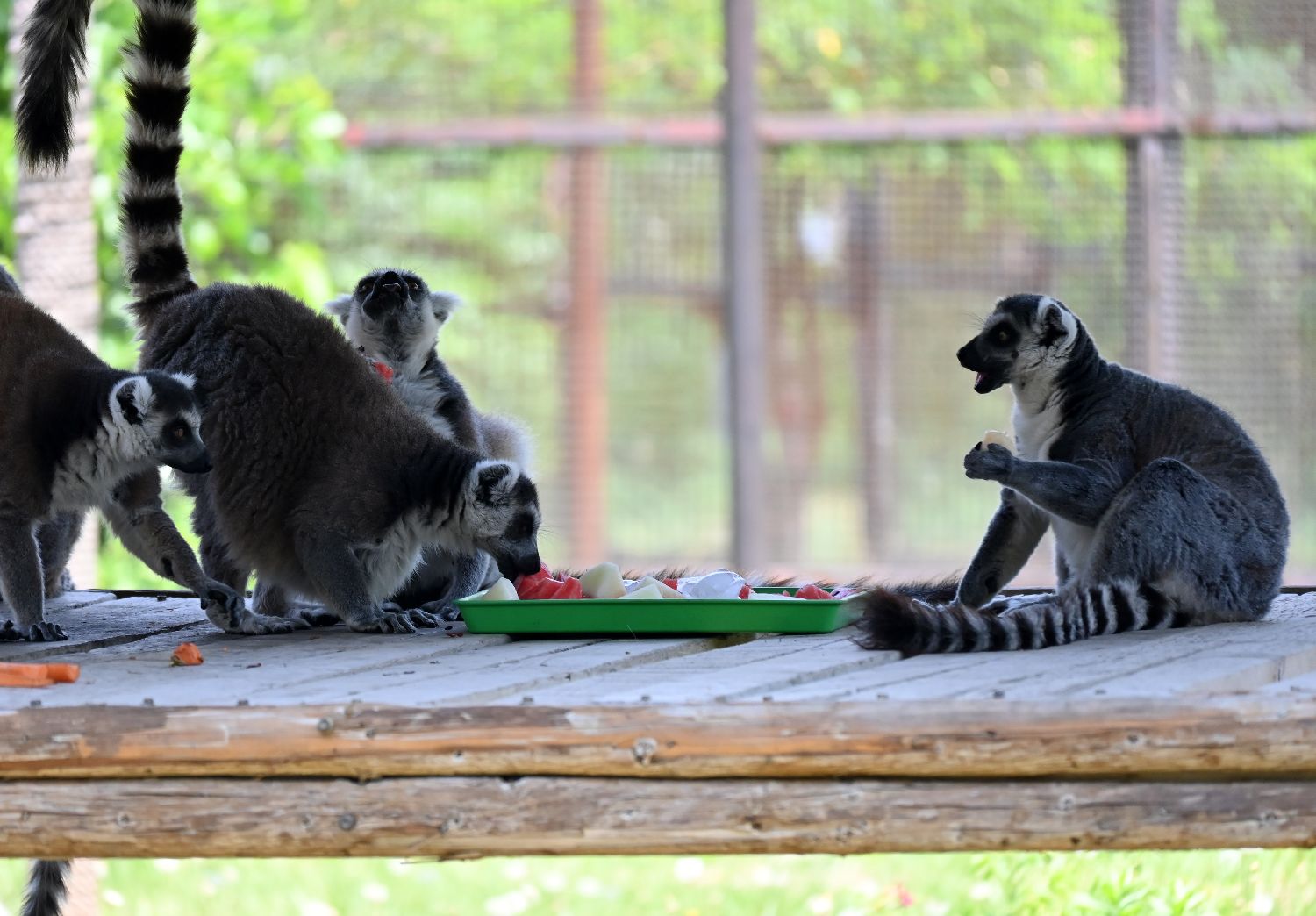 6月15日,河北省石家庄市动物园,环尾狐猴吃冰镇水果解暑。(中新社)
