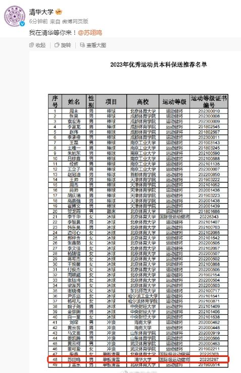16日,清华大学官方社交媒体发布了保送推荐名单截图并写道:“我在清华等你来!@苏翊鸣”(图/清华大学社交媒体截图)