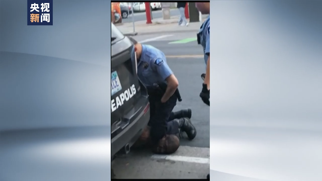 2020年5月25日,弗洛伊德在明尼阿波利斯被四名警察拘捕的过程中,被其中一名白人警察用膝盖跪压颈部长达9分29秒。(图/中国央视新闻截图)
